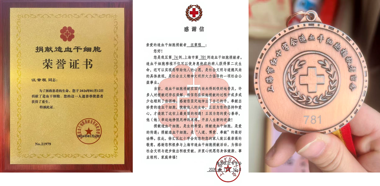 2026年1月12日,正在黄朝锋课题组实习的汪章程在复旦大学附属华山医院顺利完成造血干细胞采集,成为上海市红十字会第781例闪耀着大爱光芒的造血干细胞捐献者。这份珍贵的“生命馈赠”,为一位素未谋面的血液病患者带去了重生的希望。