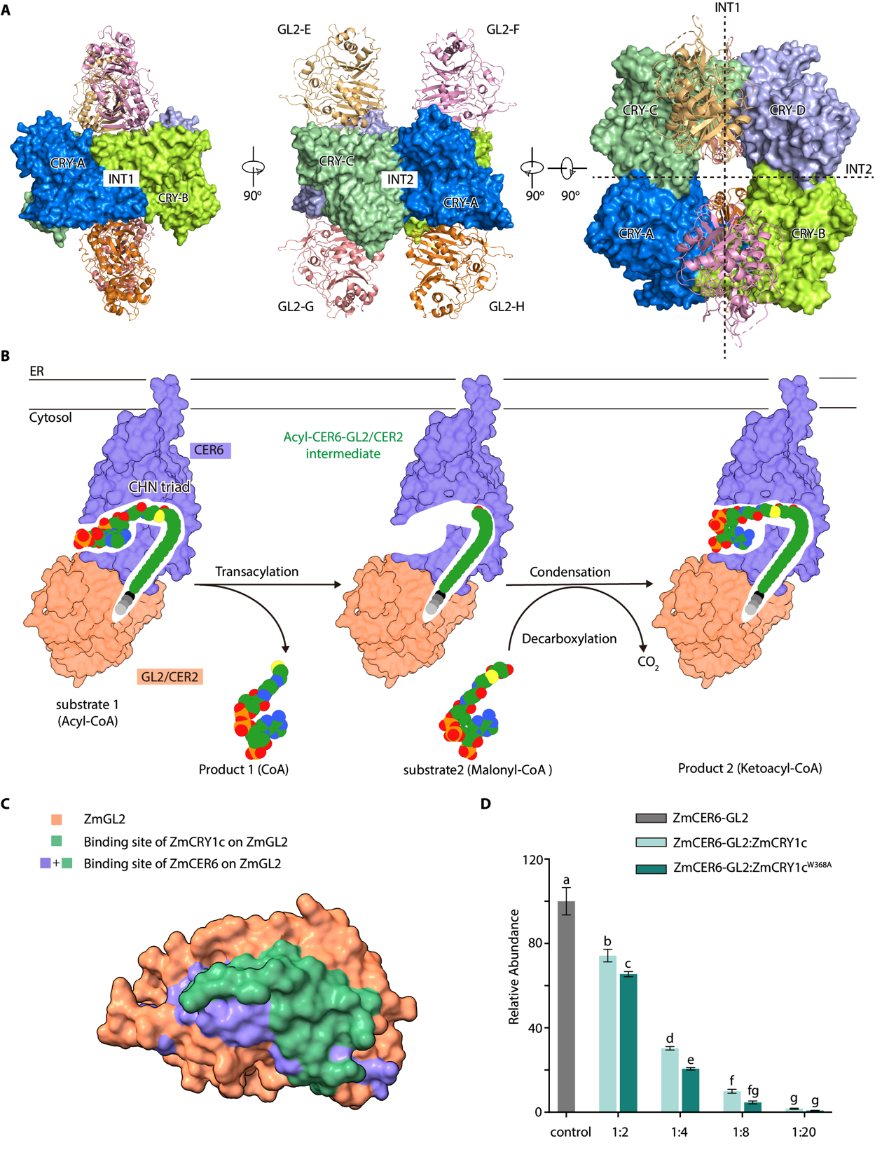 (A) ZmCRY1c-ZmGL2复合体三维结构。(B) ZmCER6-ZmGL2复合体催化超长链脂肪酸延伸的分子过程。(C-D) ZmCRY1c与ZmCER6竞争结合ZmGL2,调控ZmCER6-ZmGL2活性