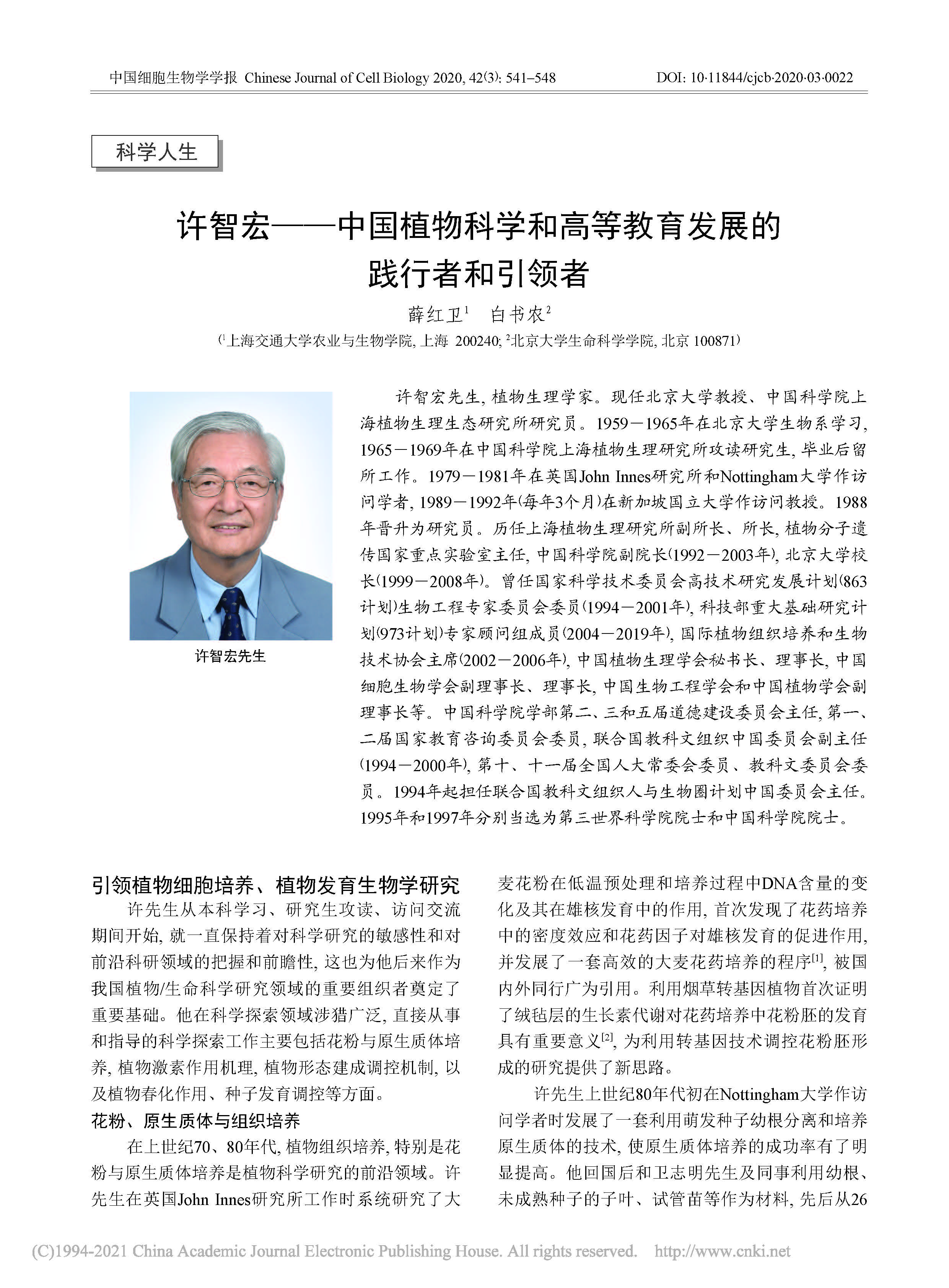 许智宏——中国植物科学和高等教育发展的 践行者和引领者(中国细胞生物学学报)