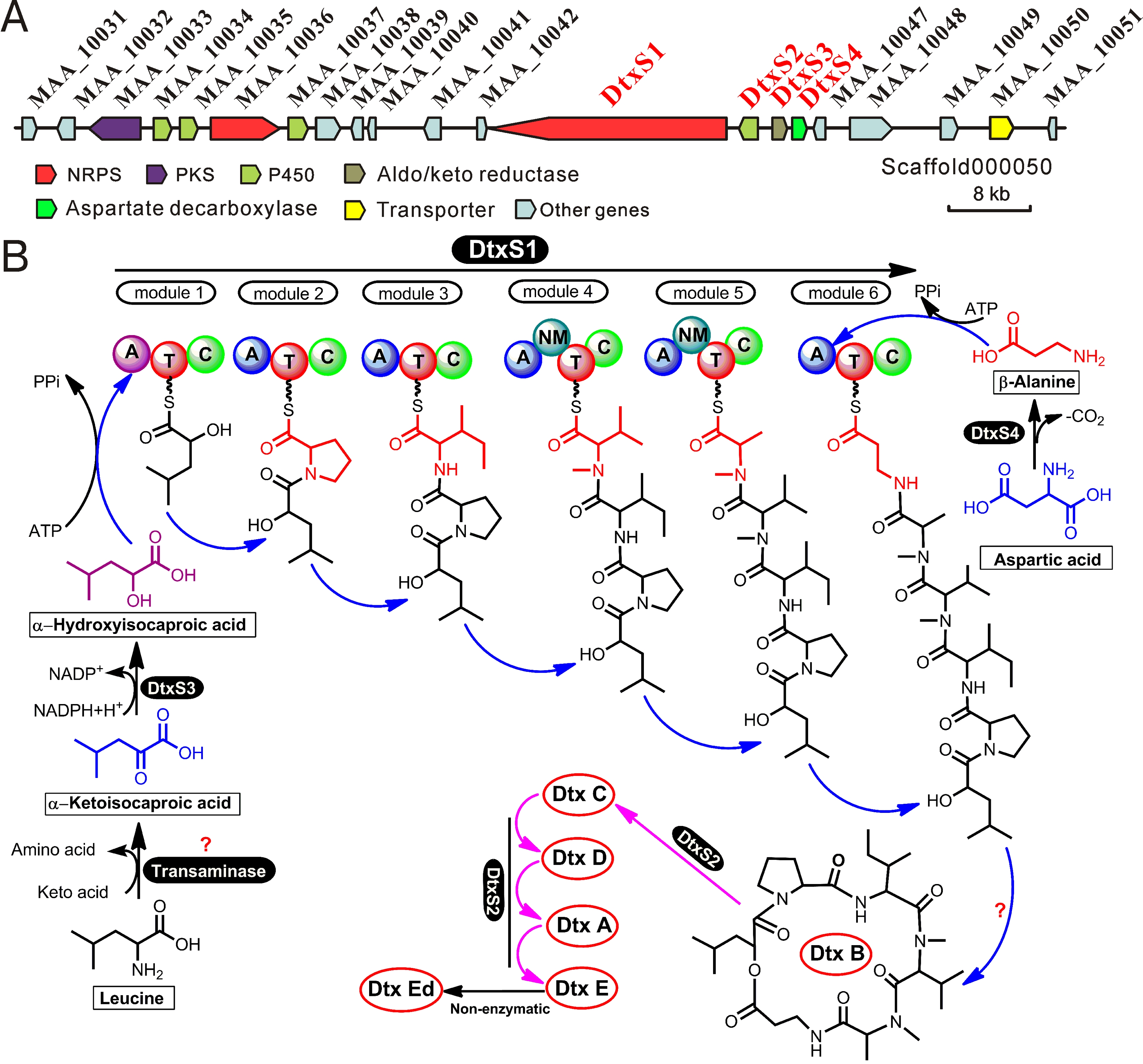 由绿僵菌产生的、具有杀虫及医药活性的非核糖体环六脂肽类次级代谢产物—破坏素(destruxin)最早于1961年被发现,目前已经鉴定的结构类似物有6大类、39种,不同结构的破坏素不仅具有广谱的杀虫活性,同时,对于癌症、老年痴呆和肝炎等疾病模型表现出不同程度的医药活性,但其生物合成途径一直不清楚。