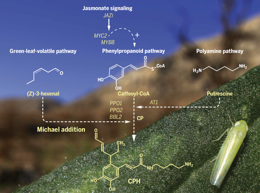 在该项研究中,研究团队在野外大田种植了由26个父母本杂交生成的共1816株重组自交系群体,这些自交系群体的基因背景各不相同,以供小叶蝉的“窃听”和宿主选择。当小叶蝉自由攻击这些植物时,它们的攻击率便可以用来帮助确定非寄主植物转变为寄主植物的遗传元素。该研究通过博物学驱动的正向遗传学与反向遗传学、转录组学及非靶向结构代谢组学相结合的全新分析方式鉴定到了一种新的植物特异性代谢产物,是植物对小叶蝉产生非寄主抗性的关键化合物,并将其命名为CPH。有趣的是,该化合物是由非常规的茉莉素元件JAZi特异性调控的,研究发现,植物只有在被小叶蝉,而非其他昆虫攻击的时候,JAZi才会在被攻击的叶片特异性表达,激活其调控的CPH合成。进一步研究发现,该化合物由一个乙酰转移酶AT1和两个多酚氧化酶PPO1和PPO2及一个小檗碱桥酶BBL2共同协调合作催化合成的。巧妙的是,该化合物凝结了3大代谢通路,其中一个关键合成通路是由植物绿叶挥发通路组成的,是植物挥发性间接防御的核心通路,另外两个通路则参与植物的直接防御物质合成。因此该研究首次解析了植物的直接和间接防御通路是如何巧妙地“对话和调度”合成其代谢武器的。最终,研究团队通过合成生物学的手段将该代谢通路整合到番茄与蚕豆等作物中,设计出小叶蝉非寄主选择的高抗作物。