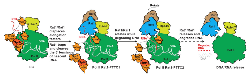 mRNA的转录终止机制在真核生物中普遍保守。当Pol II转录至基因末端的多聚腺苷化信号(Polyadenylation Site; PAS)时,pre-mRNA在PAS位点下游被切割分为两段。切割后的mRNA完成PolyA加尾后被转运至细胞质翻译,而Pol II仍然朝下游转录继续合成RNA,其转录终止依赖一个保守的5’-3’ RNA外切酶(酵母Rat1,哺乳动物XRN2,植物XRN3),针对真核细胞mRNA转录终止的机制已经被研究了多年,提出了包括“鱼雷”、“异构”等多个模型,但是其机制尚存争议。异构模型认为,核酸外切酶Rat1结合诱导Pol II构象变化,促进mRNA自发解离。鱼雷模型认为,核酸外切酶Rat1切割下游RNA并追赶Pol II,当Rat1赶上Pol II后触发mRNA解离。转录终止具体通过何种机制尚存争论。
