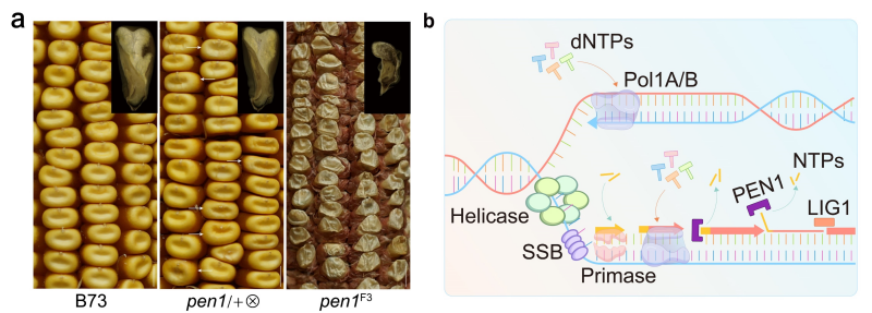 2025年6月25日,中国科学院分子植物科学卓越创新中心巫永睿研究团队联合张余研究团队以及上海师范大学王文琴研究团队在Nature Plants上发表了题为 “PEN1 catalyses RNA primer removal during plastid DNA replication in maize”的研究论文。科研人员经过八年不懈探索,最终揭示了植物质体DNA(ptDNA)复制体中RNA引物切除的核心核酸酶组分plastid-localized and Mn2+-dependent 5’-3’ exonuclease 1 (PEN1)。长期以来,植物ptDNA复制中负责RNA引物切除的核酸酶一直未被鉴定到,而PEN1的发现填补了这一关键领域的空缺,完善了ptDNA复制理论。