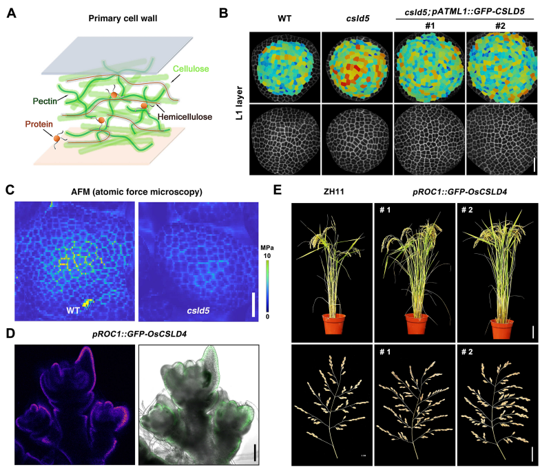 作为茎尖分生组织的外层保护结构,表皮层通过其紧密排列的细胞壁提供刚性支撑,防止内部细胞因膨压而过度扩张,维持分生组织的穹顶形态。此外,表皮细胞通过细胞壁-质膜-细胞骨架网络感知外部机械力,并将应力传递至内部组织,从而影响茎尖分生组织的活性。因此,表皮细胞在植物发育和机械应力响应中扮演着重要角色。研究发现,仅在表皮(L1)细胞中表达CSLD5,即可完全恢复csld5突变体分生组织的生长和力学特性,甚至产生比野生型更大的植株,表明不同细胞层之间存在补偿效应。基于此,该研究进一步在水稻中证实,使用特异性表达的启动子驱动CSLD5同源基因(水稻CSLD4)的表达,可以显著促进水稻花序分生组织的发育和产量。