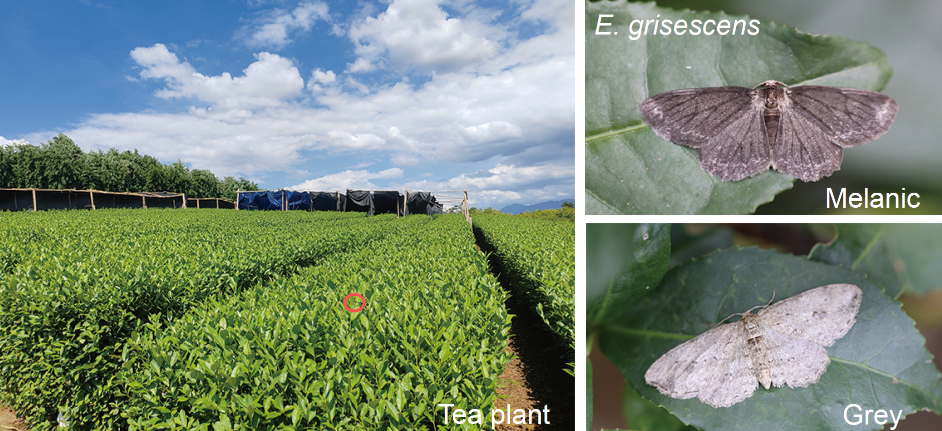 茶尺蠖(Ectropis grisescens)是我国及东亚地区危害严重的茶树害虫。在田间,茶尺蠖成虫(茶尺蛾)具有灰色型和黑色型两种色型。与桦尺蛾的“开放式”栖息场景不同,在茶园生态系统中,低矮的茶树因为密集种植、树叶遮蔽等,无论是灰色型还是黑色型的茶尺蛾,其躲避天敌的效果都“收效甚微”(图2)——文献中亦罕有关于鸟类等捕食茶尺蠖成虫的记录。因此,该系统提供了一个可以在缺乏强烈自然选择(躲避天敌)的情况下,探究黑化现象如何受到其它生态因子共同影响的独特研究模型。