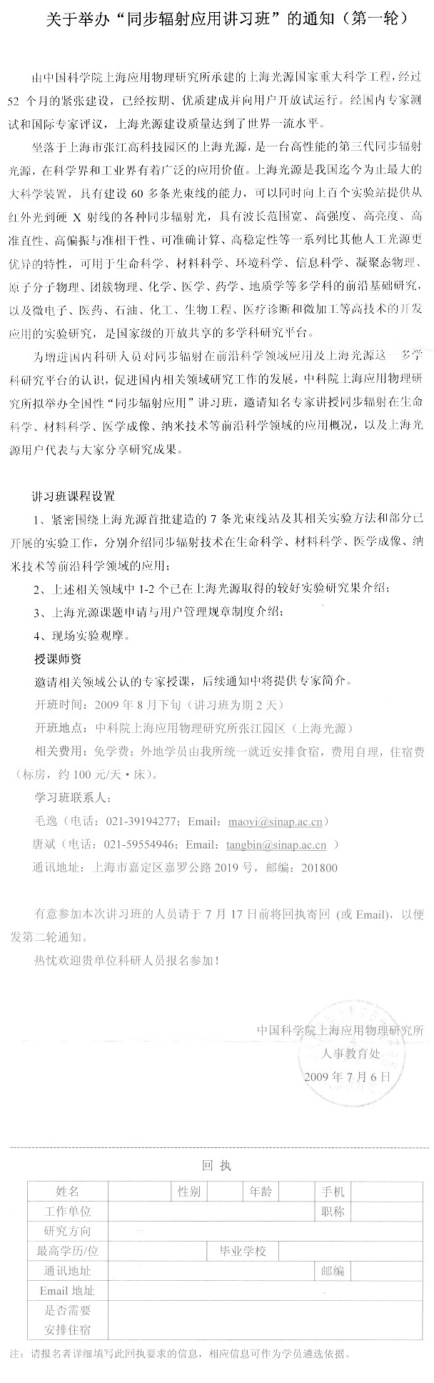 关于举办“同步辐射应用讲习班”的通知(第一轮)