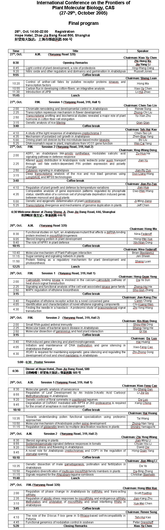 植物遗传学、功能基因组学的发展以及蛋白质组学和代谢组学平台技术的建立为深入和系统研究植物基因调控网络和蛋白质相互作用及重要生理过程的调控机理提供了基础。近年来,我国科学家在水稻基因组测序、比较基因组学等方面取得了突出的成绩,在植物发育、次生代谢等领域取得了较好的成果。为了加强国内外相关领域的交流,尤其是进一步促进植物分子生物学研究的深入,将于2005年10月26-29日在上海举办“中国科学院植物分子生物学前沿国际研讨会”。
