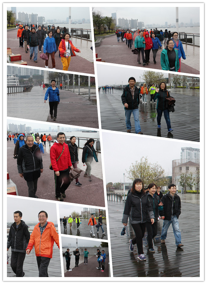 健走刚开始,就下起了一阵大雨,但是没有“下”走大家健走的信心,待雨势减弱后,在沈敏俊副所长的带领下,大家自发地按照“规定队形”继续开始健走。排列整齐的健走队伍在雨中的徐汇滨江形成了一道亮丽的风景线。健走进行到一半的时候,天亮了,雨停了,大家都说,“我们的坚持,感动了老天”。