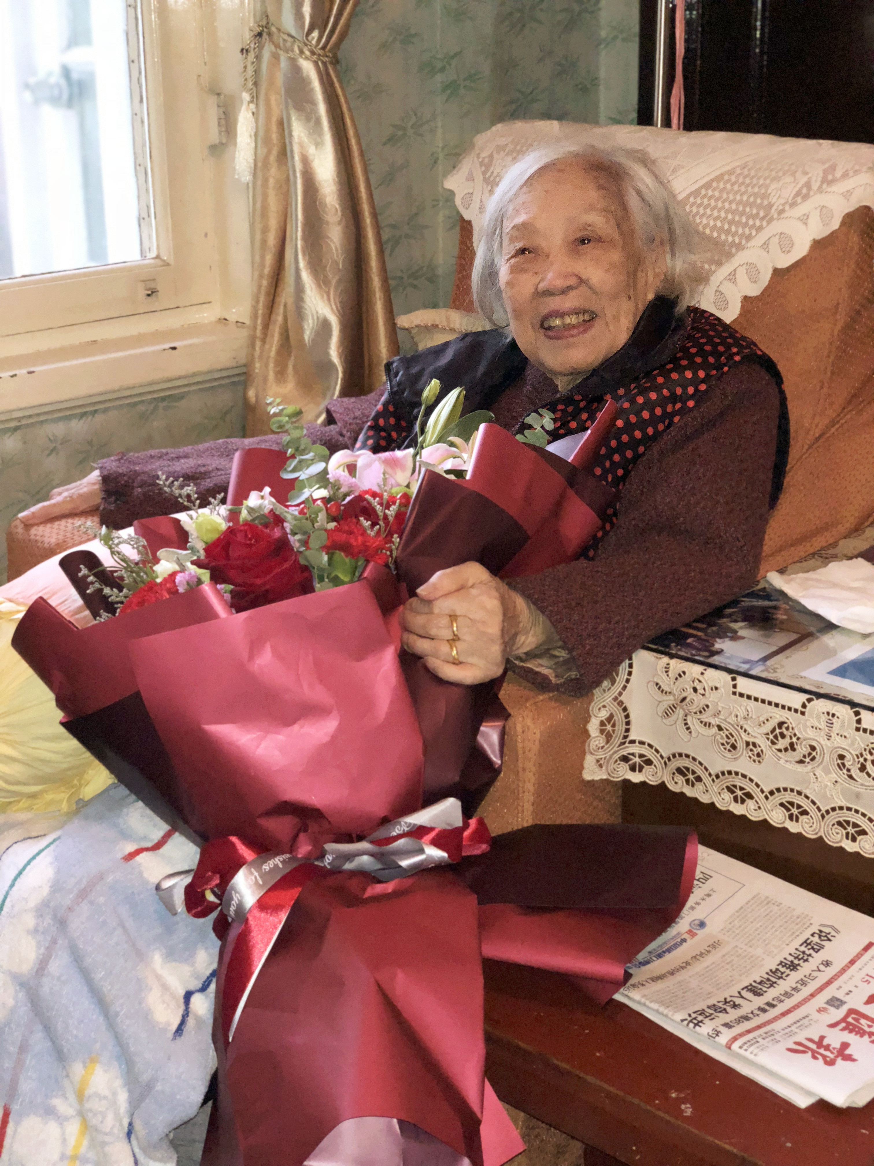 丁老先生非常高兴,感谢组织上对她的关心,她说,“我很好,谢谢你们还记得我,还专门来看我”。临走前,她与大家一一握手,祝福大家都能和她一样健康长寿。我们也祝福丁老师: